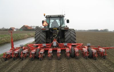 Zaaien met een 12-rijige Kleine precisiezaaimachine met opgebouwde rijenspuit voor onkruidbestrijding in de rij.